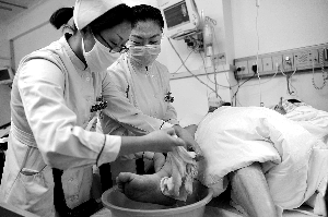 昨日,宣武醫院,護士在護理病人。今年3月,宣武醫院成為首批“優質護理服務示范工程”試點醫院。記者 王申 攝