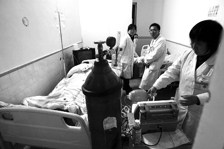 隔著窗戶,記者看到搶救室是一間病房,里面有氧氣瓶和監護儀等設施。死者靜靜地躺在病床上,身體被被子包裹著,在他身旁,監護儀顯示心跳已成一條直線。室內,4名醫護人員無奈地或坐或站。在他們記錄的病歷上顯示,他們已被困在屋內好幾個小時了。
