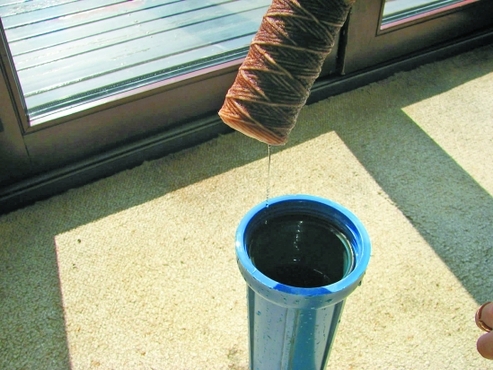 “這水簡直不能用,所以我們裝了凈水過濾器。”宋女士從家中的總水閥口拆下一個塑料裝置,這就是水質(zhì)過濾器。打開過濾器,吳華抽出了一根已經(jīng)變成黃褐色的過濾棒。“我們這里幾乎家家戶戶都安裝了這種過濾器,這種過濾棒原本是白色的,新?lián)Q的不到一周時間就變成這樣了。”
