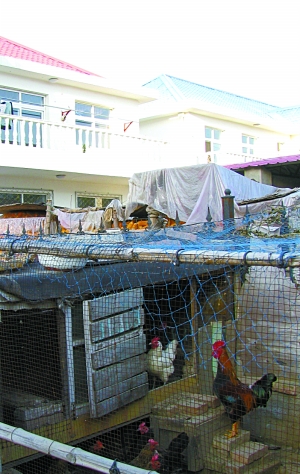 10月14日,河北永清縣董家務(wù)村新民居樓內(nèi),有村民在院里飼養(yǎng)家禽。