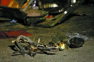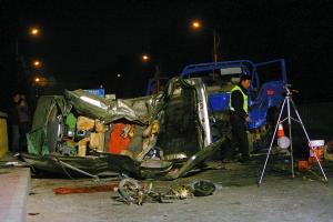 交警在事故現場勘查。昨日17時40分許,京良路京良環島2公里處發生一起多車連撞事故,4人死亡6人受傷,交通受阻4個多小時。據傷者回憶,事發時,一輛面包車自西向東行駛,試圖加速超車時,撞到一名騎自行車男子。隨后,面包車急打方向盤進入對面車道,與一輛轎車相撞,緊接著又與一輛貨車相撞。本報記者 吳江 攝