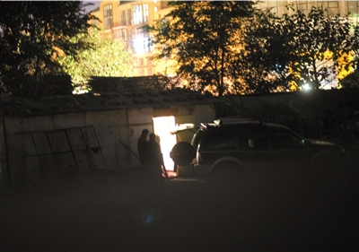 記者在隱蔽處觀察到,晚上9點前,平房內一直漆黑一片,門板上還上著鎖。9點剛過,一女子騎自行車至此將門打開,隨后一輛黑色轎車停在門口,車上下來一名身材矮胖的男子,二人先后進入平房。