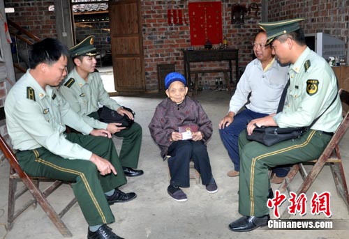 中新網(wǎng)南寧11月3日電 (石佰華 蔡錚)11月3日是百歲老人許紹忠最開(kāi)心的日子。這天,她拿到了廣西邊防民警為她辦理的嶄新的戶口簿。老人握住民警的手說(shuō):“你們是我一生中遇到的最親、最好的人。感謝黨、感謝政府,有了黨的好政策,我們老人就不會(huì)餓肚子。”