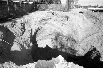 昨天凌晨兩點左右,還在工棚里熟睡的老李被一陣急促的敲門聲驚醒!俺鍪铝耍さ厮嚼玻s緊救人!”工友大聲呼救,老李和其他工友一起快速穿上衣服,拿起鐵鍬往工地沖去。老李說,他跑到工地發現,緊挨著樂園莊橋的一口豎井旁,約有10多平米的塌陷。此時,有人大喊:“下面埋了3個人,趕緊救人!”