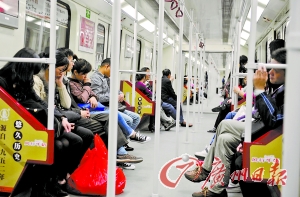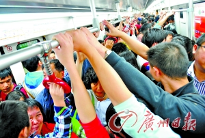 、4日的體育西路站,車廂內的乘客擁擠不堪。記者喬軍偉攝