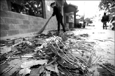大量鮮花殘骸散落,店內(nèi)的服務(wù)員正在清掃。本報(bào)記者 潘之望 攝