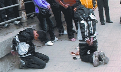 發帖網友稱:14日上午7時30分左右,在姑嫂樹路八古墩中百倉儲附近,兩名男孩被反捆雙手,跪在人行道上(見圖)。經過詢問,有人說,這兩個小孩是多次偷小店的東西被老板抓到了。該網友意識到問題有點嚴重,“當時是上班高峰時間,很快會引起交通問題;兩名男孩雙手長時間被捆,會對手臂造成損傷”,他立即報警。