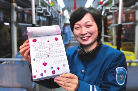 如今,“卡通公交”上掛起了留言簿,司機(jī)鐘雪梅開(kāi)始與乘客紙筆互動(dòng)。留言簿上,鐘雪梅用上了網(wǎng)絡(luò)流行的“火星文”和“華康少女體”,乘客則用打油詩(shī)和簡(jiǎn)筆畫(huà)與其PK。