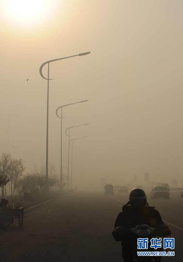 11月19日,一名市民在霧中騎車前行。當(dāng)天,一場大霧彌漫天津市區(qū),由于能見度偏低,導(dǎo)致京滬高速天津段和津塘等高速路段封閉。新華社記者岳月偉攝