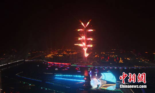 閉幕式現場,焰火倒計時自上而下噴出,在兩岸煙花景觀的襯托下,“羊”字華麗現身,清晰圓夢于閉幕式。高500米,寬300米,總面積達15萬平方米的漢字造型“羊”字完美綻放,足足停留8秒,驚艷現場。