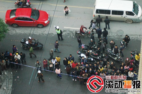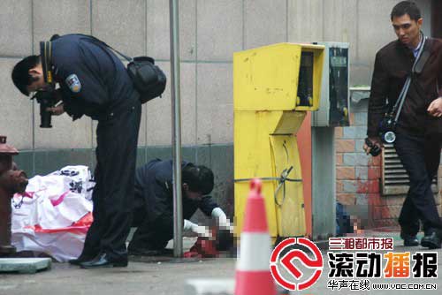 昨日下午3時10分,記者趕到事發現場看到,靠近大樓墻壁的位置,放著一具遺體。遺體身上被塑料膜覆蓋,只露出頭部,黑色頭發。幾米開外,有一只黑色運動鞋。進出大樓的通道有保安把守。而事發地點周圍,都已經被警戒線包圍起來。警戒線內,幾名辦案人員正在忙碌著。因為事發地點位處沿街商用樓外,靠近鬧市,警戒線外,圍觀的市民一直不少。
