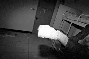 昨日,北京電子科技職業(yè)學(xué)院亦莊校區(qū)對面的宿舍樓里,一名學(xué)生伸出自己被打受傷的手臂。本報(bào)記者 吳江 攝