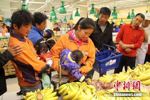 6日,常州淹城野生動物世界三只來自非洲幾內亞的小猩猩,在飼養員及管理人員帶領下,來到常州市區的一超市內,讓小猩猩們親自挑選過冬水果。剛一進場時,小家伙們在飼養員懷里還有點膽怯。但是看到賣場里各式的貨物,立即露出頭來東張西望。因為小猩猩們都穿著精美的唐裝,許多顧客還以為是抱著的是小嬰兒,不過當小猩猩黑呼呼、長著長毛的手和腳露出來時,有人就吃驚的喊道:“是猴子”。隨行的工作人員解釋后,大家才得知是動物園的猩猩來逛超市挑水果。