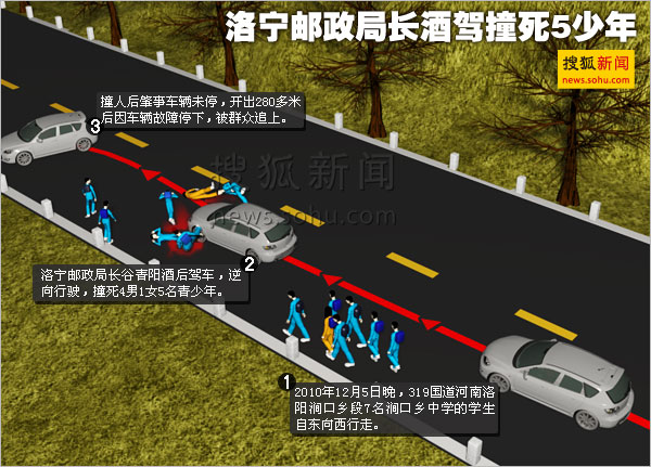據(jù)通報(bào),12月5日23時(shí)30分許,洛陽(yáng)市洛寧縣郵政局局長(zhǎng)谷青陽(yáng),酒后駕駛黑色帕薩特牌轎車(chē),沿S319省道(安虎線)由東向西行至79公里處(洛寧縣澗口鄉(xiāng)東村路段),逆向行駛與道路南側(cè)多名行人相撞,造成洛寧縣澗口鄉(xiāng)中學(xué)3名初中生當(dāng)場(chǎng)死亡,澗口鄉(xiāng)2名青少年搶救無(wú)效死亡,并導(dǎo)致車(chē)輛損壞。