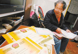 劉恭信搞一輩子發明換來一桌子的獎狀。記者 何曉剛 攝