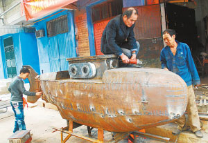 李玉明與他手工打造的潛艇。記者 胡偉鳴 攝
