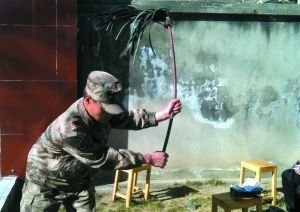 甘孜軍分區獨立營戰士演示撲火過程。他使用的,就是當地的主要滅火工具“塑料拖把”。