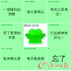 上學(xué)的時候,寫日記是很多人都覺得挺麻煩的一件事,“每天都在學(xué)校,有什么值得記的呢?”近來,一種叫“九宮格日記”的小玩意卻讓這些年輕人又恢復(fù)了寫日記的習(xí)慣。在網(wǎng)上搜索,很容易就能找到提供這種服務(wù)的網(wǎng)站。經(jīng)過注冊后,就可以開始寫日記啦!不過,這個“日記本”可有點特別,是一個被分成了九個小方格的一個大方塊,每一個小方格上都寫明了這一格的主題,比如“開心的事情”、“今天比昨天的進(jìn)步”、“心情感悟”等等。當(dāng)完成了全部九個格后,一篇“九宮格日記”就大功告成了。