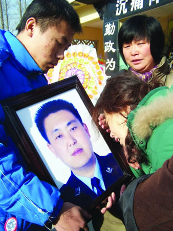8日上午10時(shí),在陳銳的追悼會(huì)上,妻子姚愛悅哭泣著將丈夫的人民警察證握在手心,一遍一遍親吻那張被相機(jī)微縮了的面孔;16歲的兒子陳耀宇手捧父親的遺像,早已哭干了眼淚。“我們一家三口還沒有合過影,爸爸答應(yīng)說過一陣子去補(bǔ)拍一個(gè)全家福……”陳耀宇說。