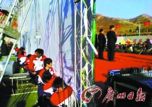 近日,網友“在西安”在其微博上上傳了一張照片。據其介紹,12月7日,藍田縣小寨初中舉辦“西安市農村(山區)標準化寄宿制學校竣工儀式”。當時,主席臺布景多處被北風撕裂,于是20多名學生坐在了布景背后的鋼架上,一邊吹著風,防止布景被風吹倒,一邊透過布景的裂縫觀看儀式。“在西安”發出感慨:“一個完美的儀式就那么重要嗎?”而校方此舉也被眾多網友痛批是形式主義。