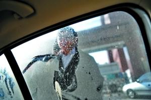 昨日,北太平莊派出所,當事律師在查看車玻璃上的腳印,他報警稱深夜遭襲。本報記者楊杰攝
