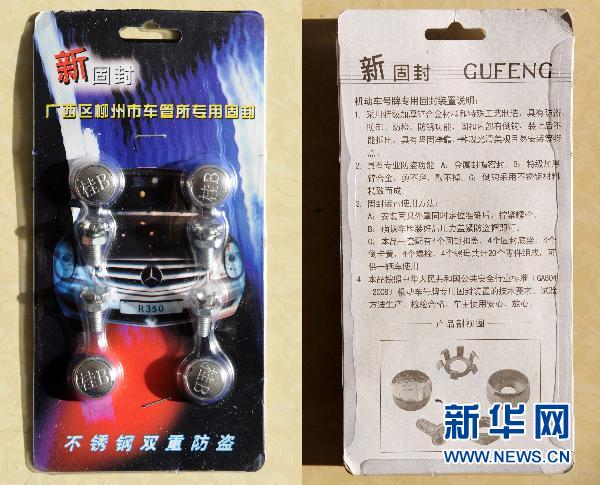 廣西柳州市交警部門(mén)日前推行新的機(jī)動(dòng)車(chē)固封裝置,每個(gè)號(hào)牌的4個(gè)安裝孔均須安裝新的固封螺帽,螺帽上要壓有發(fā)牌機(jī)關(guān)代號(hào)“桂B(yǎng)”,車(chē)主需交費(fèi)27元。 一套簡(jiǎn)單螺帽裝置就要27元,柳州交警部門(mén)強(qiáng)推的固封螺帽被網(wǎng)民怒稱(chēng)為“史上最貴螺帽”!網(wǎng)友通過(guò)大量事實(shí)論證,這樣的固封裝置標(biāo)準(zhǔn)售價(jià)應(yīng)為1元一個(gè),柳州私家車(chē)成了“唐僧肉”。新華社記者李斌攝