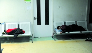 “得等四天才能做上檢查,還不知道住哪兒呢?”在醫院二層樓道盡頭的角落里,從保定來的趙德江正蹲在墻角喝水,在身邊的長椅上,患病的孩子由媽媽和姥姥在照顧,一個裝著他們全部家當的牛仔旅行包放在地上。趙德江告訴記者,他兩個月大的女兒眼睛總是不自然地四處轉動,在當地醫院做了全面檢查后,醫生懷疑與腦神經有關,建議他帶著孩子“去北京找專家”!皺z查預約在下周二,外面最便宜的住一晚上也80元,這還沒看上病呢,仨大人就得花不少錢!庇谑勤w德江琢磨著,先在醫院里待著,“等有人轟的時候再想辦法。”記者看到,像趙德江這樣為省下錢給孩子看病而拖家帶口在醫院樓道內打游擊的家長并不在少數。