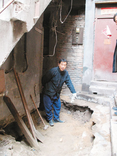 25日上午,記者來到人民西巷36號院,此時,通往后院的必經(jīng)路已經(jīng)完全塌陷,形成一個12平方米的塌陷面。住戶們正不斷地?cái)嚢柚匙雍退啵瑢Υ罂舆M(jìn)行回填。塌陷的大坑致使兩戶居民房屋部分懸空。
