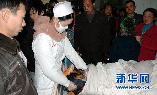 12月27日,醫(yī)護人員正在搶救受傷的孩子。當(dāng)日早晨,湖南衡南縣松江鎮(zhèn)一輛由東塘村開往因果村的三輪車運送20名小學(xué)生,在駛到因果橋時,發(fā)生交通意外,整車墜入河中。截至目前,遇難人數(shù)已上升至14人,其他6名受傷學(xué)生正在醫(yī)院接受救治。新華社記者 韓曦樂 攝
