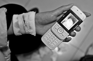 阿玲受傷的手緊握手機,手機屏幕顯示的是她整容前的照片。陳侄輝攝