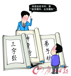 武昌區九龍井小學語文教研組主任魏賢佐介紹,該校在教學生讀經典時,重新選擇文章,對《三字經》、《弟子規》、《增廣賢文》等經典文本進行了打印編排,“中國國學經典中大多數內容都是好的,但也有一些不科學或與時代發展相悖的東西,如封建思想嚴重,輕視女性、輕視勞動等”。
