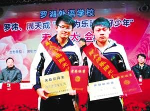 就在深圳益田村一個(gè)老人跌倒后無人出手相助不治身亡的悲劇剛過去不久,羅湖區(qū)兩位少年卻以他們見義勇為的善良之舉,感動(dòng)了千萬的深圳人。12日,深圳市召開羅煒、周天成“助人為樂陽光好少年”表彰大會(huì),分別給予兩人各1萬元的獎(jiǎng)勵(lì)慰問金。