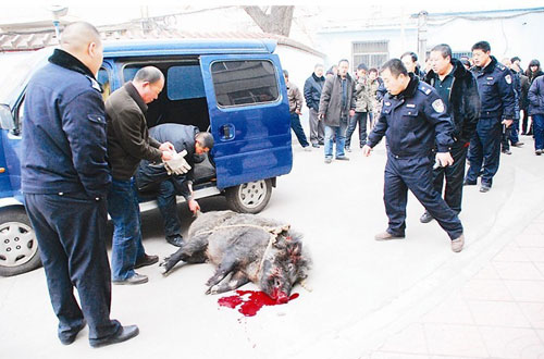 正當人們準備下手之際,這頭野豬再次發威,朝眼前的人們發動了又一輪攻擊。人們被驚得四處躲避,野豬繞著醫院內的通道瘋狂地飛奔起來,由門診樓到花園,再由花園到停車場,橫沖直撞。其間,醫院的上空又陸續傳來數聲槍響。最后,身中數槍、精疲力竭的野豬又一次躺在地上。