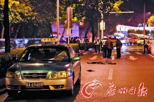 昨晚記者趕到現(xiàn)場(chǎng),警方已拉上封鎖線,對(duì)現(xiàn)場(chǎng)進(jìn)行勘驗(yàn),并將肇事司機(jī)帶上警車。記者看到,肇事男司機(jī)中等身材,身高1.72左右。斑馬線的北邊約15米處,倒在血泊之中的林先生已被一塊大布覆蓋。在尸體北面的六七米之處,一輛車牌號(hào)為粵A694B8的綠色出租車停在路邊。記者借助路燈,卻沒(méi)看到馬路上有任何的剎車痕跡。路邊的目擊者稱,當(dāng)時(shí)的車速飛快,估計(jì)都沒(méi)剎車。