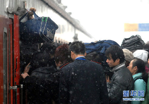 1月19日,杭州火車站幾位旅客排隊擠上回家的列車。新華社記者 鞠煥宗 攝