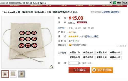 一部《讓子彈飛》令“麻匪面具”紅透半邊天。在淘寶網上,“麻匪面具”、“麻匪帽”、“麻匪頭套”等衍生品銷售異常火爆。在搜索欄鍵入“麻匪面具”,相關寶貝多達491件,價格從9元到30元不等。在淘寶商城一家店鋪里,記者看到,短短30天就賣掉了1477件“麻匪面具”。售賣“麻匪面具”的西安一家網店的客服告訴記者,從1筒到9筒,大哥“張麻子”戴的9筒,以及麻匪火并時混淆陣仗的4筒最為熱銷。