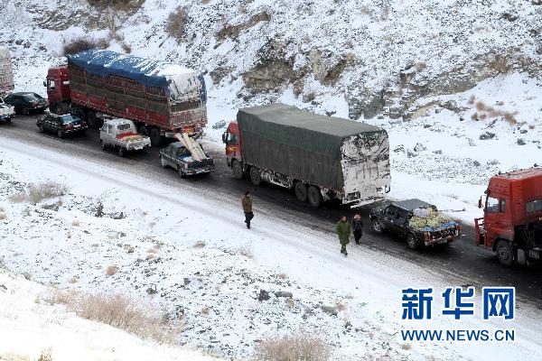 1月25日,新疆303省道哈密天山路段交通受阻,車輛排起了長隊。當日,受冷空氣影響,新疆哈密北部出現風雪天氣,造成新疆303省道哈密天山路段路面結冰,交通受到影響。當地交通部門積極采取措施清除路面結冰、疏導交通,確保行車安全和道路暢通。新華社發(蔡增樂 攝)
