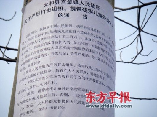 村頭電線桿上措辭激烈的、宣誓將嚴懲攜帶殘疾兒童出外乞討者的標語還反射著鮮艷的墨色,那是前一天才急忙張貼上去的。標語的旁邊是措辭更加強烈的宮集鎮政府通告,敦促這些人十日內向公安機關投案自首,否則嚴懲,這份通告的落款也是前一天。