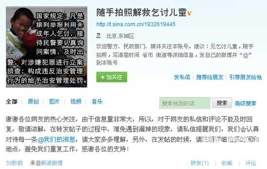 資料圖:“隨手拍照解救乞討兒童”微博截圖
