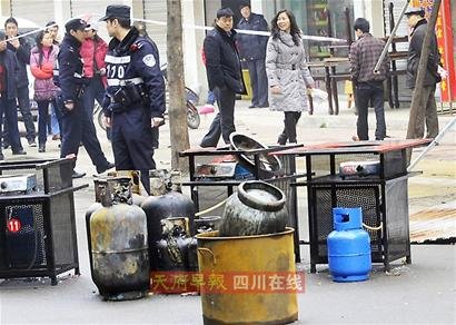上午9時過,火鍋店內的10多個煤氣罐都被拿出來放在了街道中間,警方在外圍拉起了警戒線,嚴禁圍觀市民吸煙。一位民警提醒同事:“這個罐子還在漏氣,大家要警惕。”成都晚報記者靠近被燒的火鍋店,看到里面一片狼藉,焦黑的桌椅板凳、鍋碗瓢盆四處散落,墻上的涂料都被燒干脫落了。