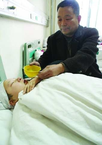資料圖片:父親張玉欣正在給躺在病床上的張廣秀喂水。(圖片來源:齊魯晚報)