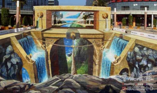 3D地畫顧名思義就是以室外地面為媒介,制造出視覺上的立體效果,令人身臨其境。3D畫為什么這么“真”?據作者齊興華介紹,在創作之前,他會先親自去現場考察,拍下照片,然后根據場地測量墻高、寬和縱深。這幅巨型的“獅門峽谷”3D畫,想象大膽,效果逼真。