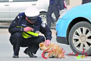 “wsy930117”在這條名叫“敬禮,實(shí)拍最有愛心的交警,我淚噴了!”的帖子中這樣描述當(dāng)時(shí)的事發(fā)經(jīng)過(guò),“一只無(wú)人認(rèn)領(lǐng)的小狗過(guò)馬路時(shí)被過(guò)往車輛斬?cái)嗳ヂ罚T诼分虚g一動(dòng)不動(dòng),并發(fā)出呻吟。這時(shí),一位好心的交警走到小狗面前觀察小狗,接著用手輕撫小狗的頭部,后來(lái),他用項(xiàng)圈將小狗牽到了路邊,小狗安全獲救。”