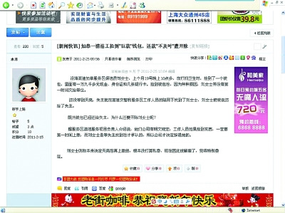 一名在沈海高速如皋服務區內做保潔的女工,深夜撿到一個錢包后沒有上交,而是帶回家。根據監控錄像,交警帶著失主找到清潔工后,清潔工將裝有近2萬元現金和重要證件的錢包交還失主,并謝絕了酬謝。但此后,這名清潔工所在單位卻以“還款不及時”為由,將其開除。該女工感覺自己很冤,“好事難道做不得?”而服務區相關人士則稱是按規定辦事。孰是孰非,雙方各執一詞,并在當地引發眾多議論。
