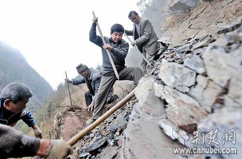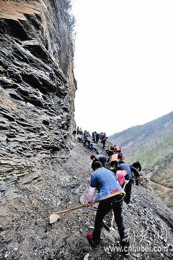 昨日11時17分,爆破聲后,碎石和粉塵緩緩落定,高山深谷阻隔的建始縣龍坪鄉(xiāng)店子坪村再次回到寧靜中。村支書王光國和60多名村民回到百米高的懸崖上,鋤頭、鋼釬和勞動號子又響了起來。