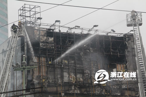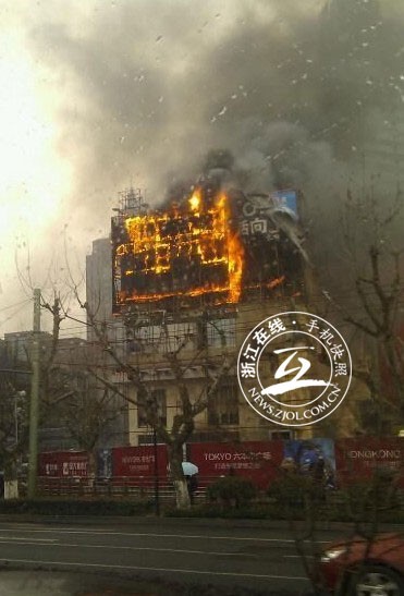 12時16分,路過這個路口的浙江在線記者遠遠看到,正在進行外墻裝修的國大城市廣場燃燒著熊熊大火。走近一看,起火點為一茶一坐,該樓北面上面兩層已經被火籠罩,上空濃煙滾滾,不時還傳出爆炸的聲音。隨后,記者看到杭州消防部門的消防車趕到現場施救。