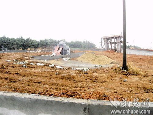 27日,記者在現場看到,該墓地建在一村級公路旁的山坡上,大體呈橢圓形,遠遠望去十分壯觀。墓地還未完工,但門樓已建成,土地已平整(如圖)。據墓地的一名看護人員稱,墓地占地面積一畝多,是在外地做生意發財的余某為父母建造的。該墓地還占用了緊鄰的壽橋村1組的土地約0.4畝,這塊地還是用12組的土地與1組交換來的。墓地承包給一個包工頭,具體建筑費用不詳。