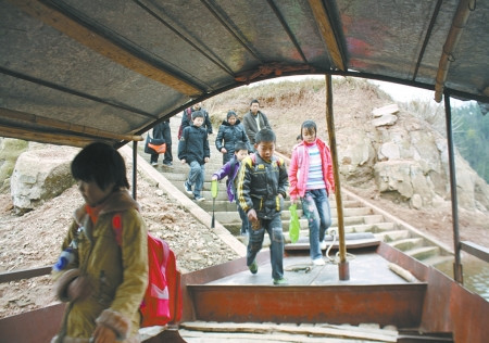 每天中午或傍晚,山路上飄來銀鈴般的歡笑聲,準是孩子們放學了。他們把船停穩,然后到岸上一個一個接孩子們上船。