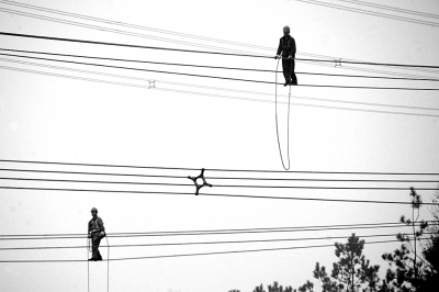 從地下電站架出的電線,每厘米都要經(jīng)宜昌輸電中心空中徒步檢查。目前,輸電線安檢工作正在緊鑼密鼓地進(jìn)行。
