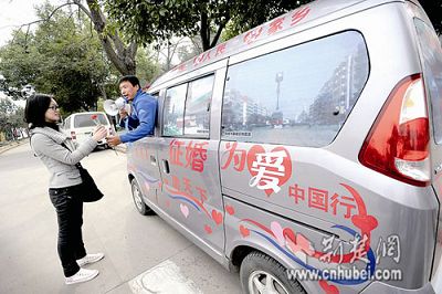 “征婚游天下,為愛中國行!弊蛉丈衔,一名黑龍江男子開著一輛面包車,來到武漢大學門口吆喝。這哥們不是開婚慶公司的,也不是為“相親節目”搖旗吶喊,而是走遍全國為自己征婚的金英奇。